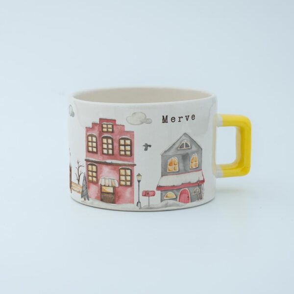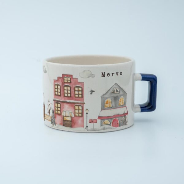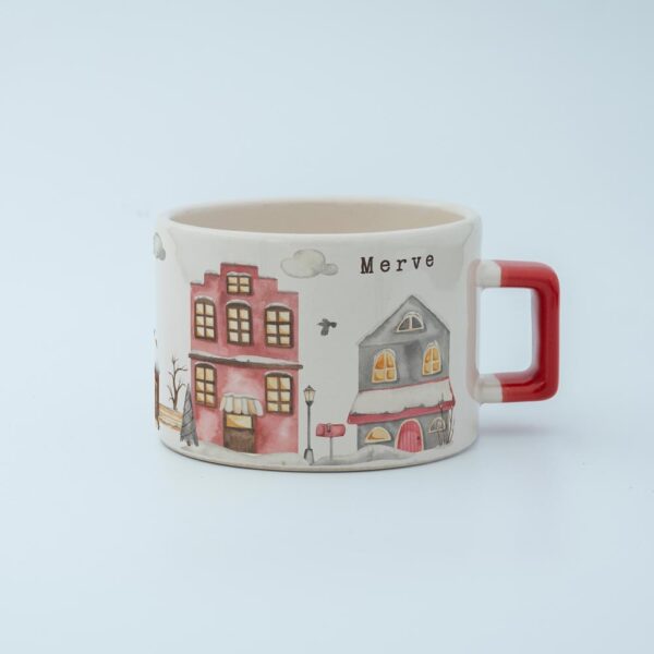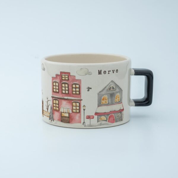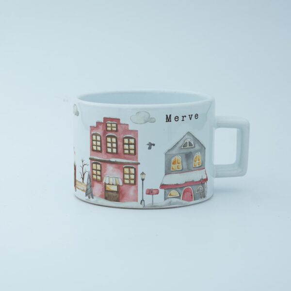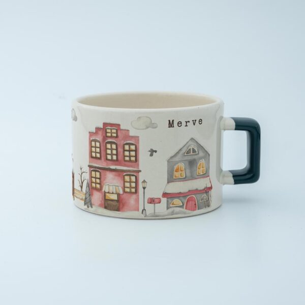 Soğuk kış günlerinde içinizi ısıtacak sıcacık bir içecek keyfi için tasarlanmış bu özel fincan, huzurlu bir kış köyü manzarasıyla süslenmiştir.
