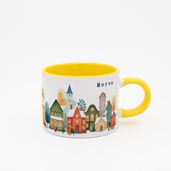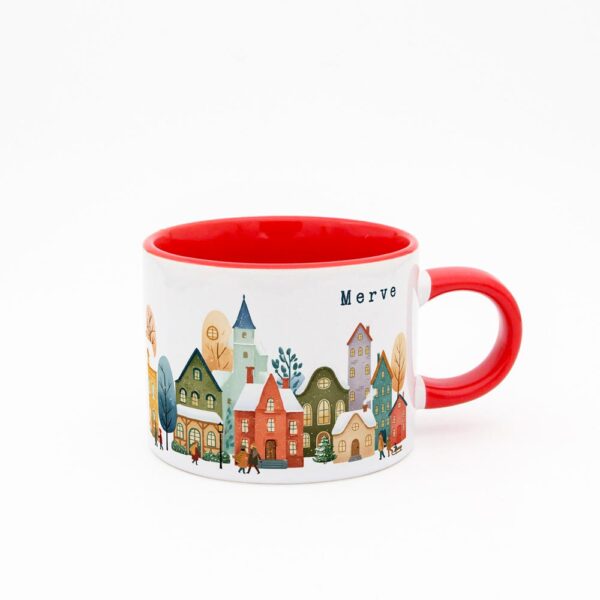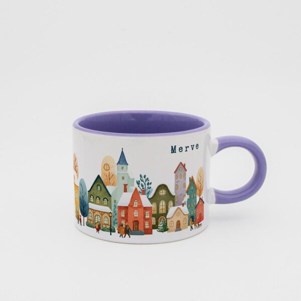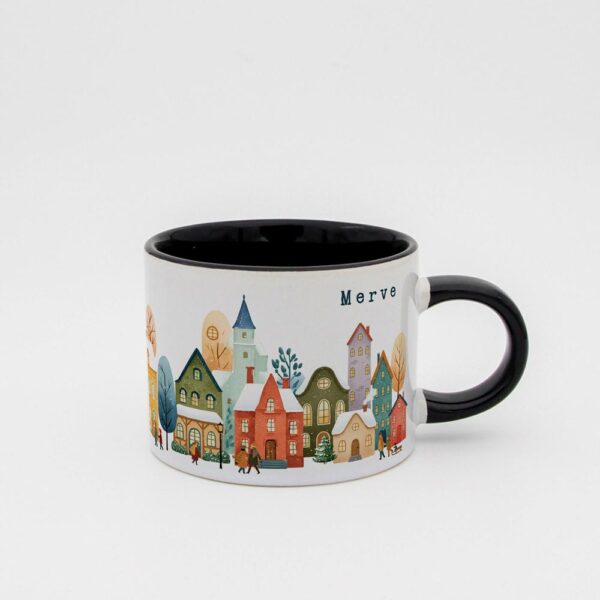 Soğuk kış günlerinde içinizi ısıtacak sıcacık bir içecek keyfi için tasarlanmış bu özel fincan, huzurlu bir kış köyü manzarasıyla süslenmiştir.