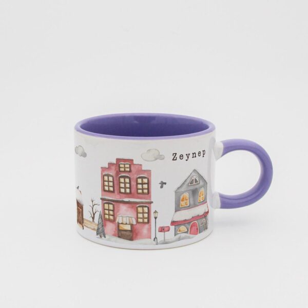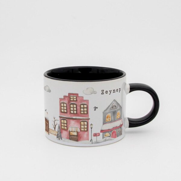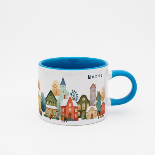Soğuk kış günlerinde içinizi ısıtacak sıcacık bir içecek keyfi için tasarlanmış bu özel fincan, huzurlu bir kış köyü manzarasıyla süslenmiştir.