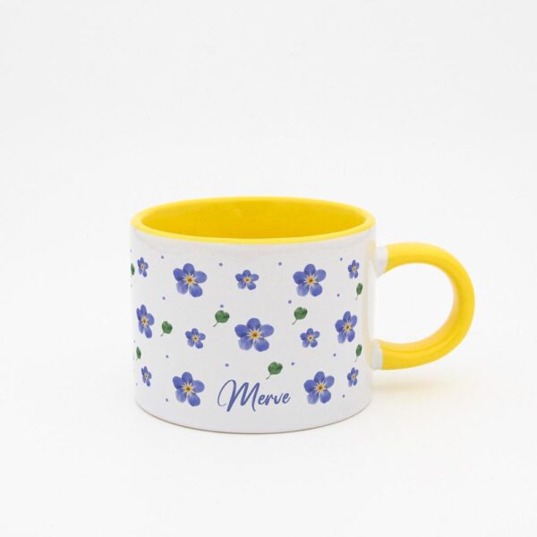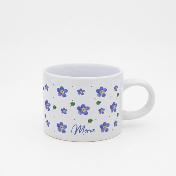 Zarif ve narin unutma beni çiçeklerinin büyüleyici güzelliğini ve isminizi birleştiren bu fincan, sevdiklerinizle paylaştığınız her kahve ve çay keyfini daha da anlamlı kılacak.